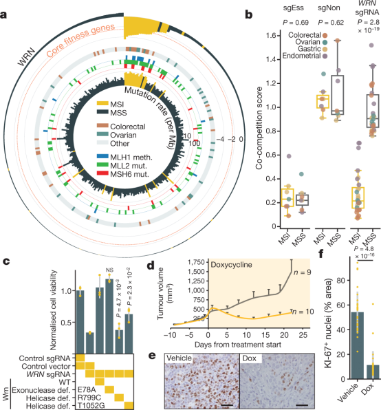 图5a展示了针对多个细胞系的循环图,表明WRN的敲除显著影响了MSI的癌症细胞系,尤其是有MLH1甲基化、MLL2和MSH6突变的癌症类型。
