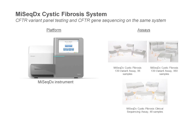 Illumina囊性纤维化检测产品由FDA批准并且经验证具有严格的性能指标。两种方法均适用于MiSeqDx仪器,它是第一个经FDA批准和CE-IVD认证的NGS体外诊断(IVD)检测平台。