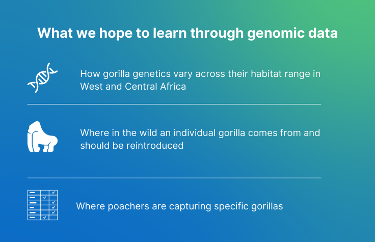 目前,Magdalena正与巴塞罗那庞培法布拉大学比较基因组学团队负责人Tomas Marques-Bonet以及Illumina iConserve计划合作,以绘制大猩猩种群在其栖息地范围内的遗传变异谱图。目前,尚无可靠的分子检测方法来对救助大猩猩进行基因分型,也没有方法确定大猩猩的原始种群。这项合作项目的任务是在所有国家/地区和国家公园创建第一个大猩猩基因组图谱,以便对未来从野外捕获的大猩猩进行测序并与它们的起源种群进行匹配。该工具有助于将大猩猩重新安置到靠近其来源地的保护区,从而增加重新引入其原生群体的成功率。