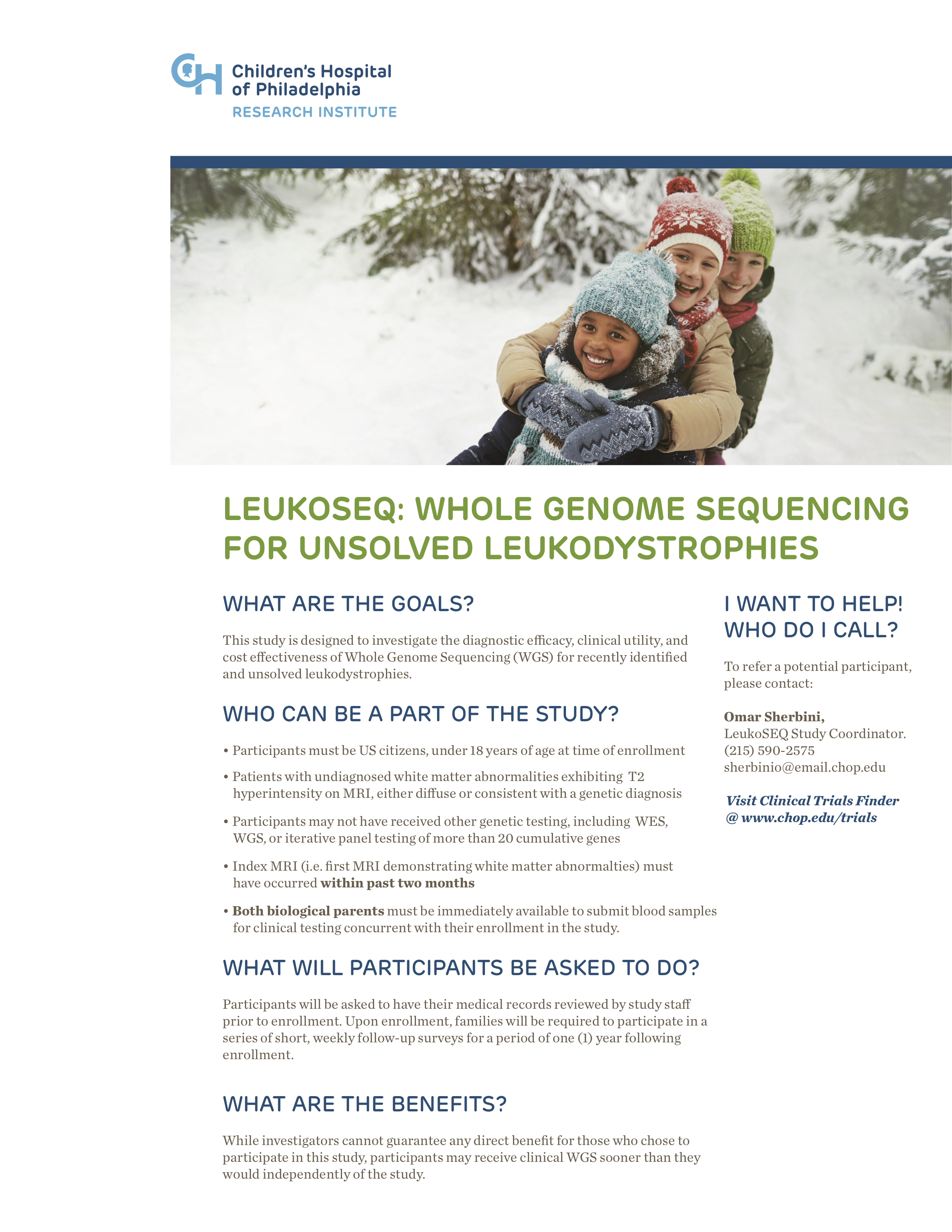获取更多关于LeukoSEQ研究及资格要求的信息,或推荐符合要求的患者,请发送电子邮件 sherbinio@email.chop.edu 或致电(215)590-2575联系研究协调员Omar Sherbini。