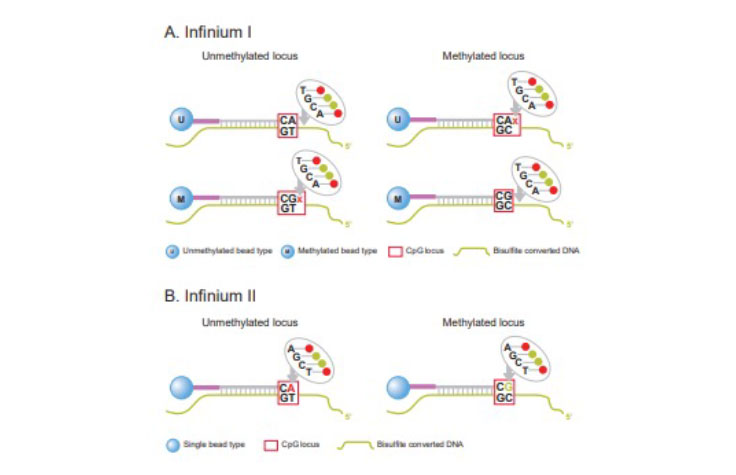 Illumina methylation BeadChips employ both Infinium I and Infinium II assays, enhancing the overall breadth of coverage. (A) Infinium I probe designs use 2 bead types per CpG locus, 1 each for the methylated and unmethylated states. (B) Infinium II probe designs use 1 bead type for both states.