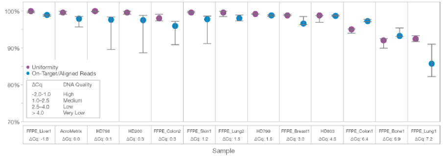 使用AmpliSeq for Illumina Focus Panel对从质量各异的FFPE组织和HD样本中提取的DNA进行评估,并用MiniSeq和MiSeq系统进行测序。Cq是一项指标,用于衡量从FFPE组织中分离的DNA质量。