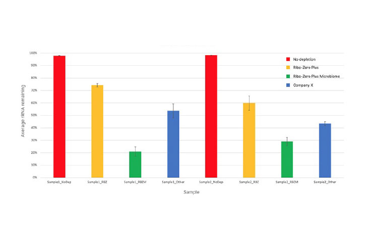 Ribo-Zero Plus Microbiome rRNA Depletion Kit可有效去除粪便样本中的rRNA(5S、16S和23S)水平。将Ribo-Zero Plus rRNA Depletion试剂盒的检测结果与X公司的市售核酸去除试剂盒进行了比较。共检测了两份粪便混合物样品。
