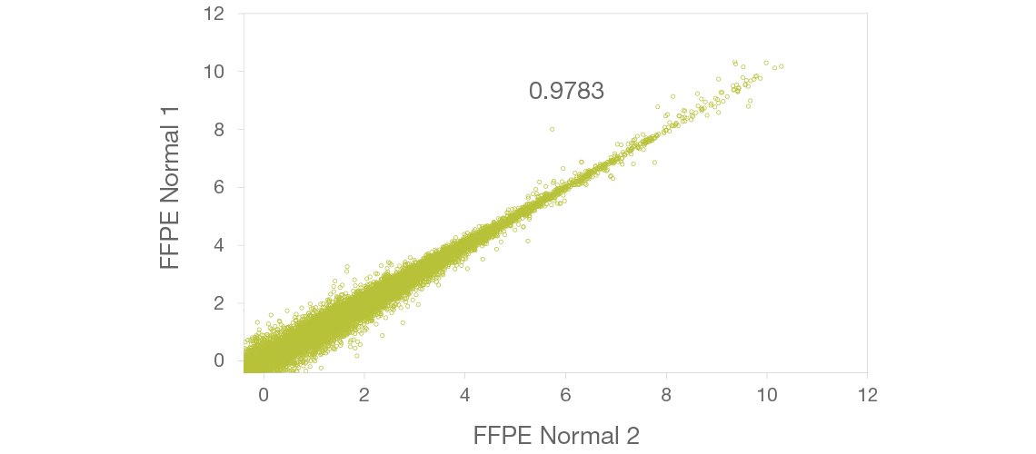 技术平行分析间的高重复性反映了对RNA丰度一致、精确的测量。FFPE组织的技术平行分析显示出高度的一致性,表明文库制备的性能稳定。轴为log2(FPKM)。显示 R2 值。