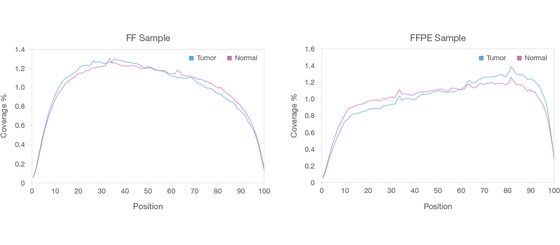 TruSeq Stranded Total RNA在新鲜冷冻(FF,上图)和FFPE(下图)肿瘤以及匹配正常乳腺组织中的前1000个表达转录本中具有出色的覆盖度,比对链read>98%。X轴:沿转录本的位置,Y轴:组合read的覆盖度百分比。
