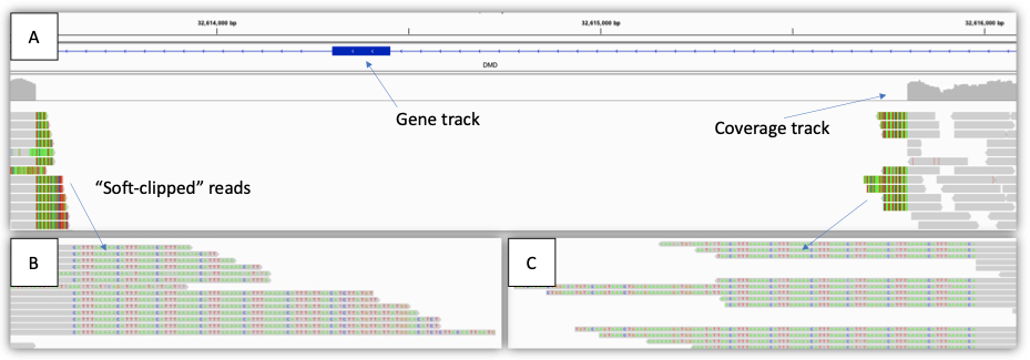 图3:杜氏肌营养不良症男性患者中单个外显子缺失(2 kb)的示例——(A) IGV视图显示受影响的区域,包括基因轨迹、覆盖轨迹和比对read轨迹。请注意,整个区域的覆盖度降至零,表明存在半合子缺失。(B)、(C) 放大的IGV视图显示“软剪辑”read。每个read的灰色部分与参考序列匹配,而彩色字母部分则不匹配(软剪辑)。在本例中,软剪辑read定位到缺失断点的另一端。这些read可用于生成SV检出。