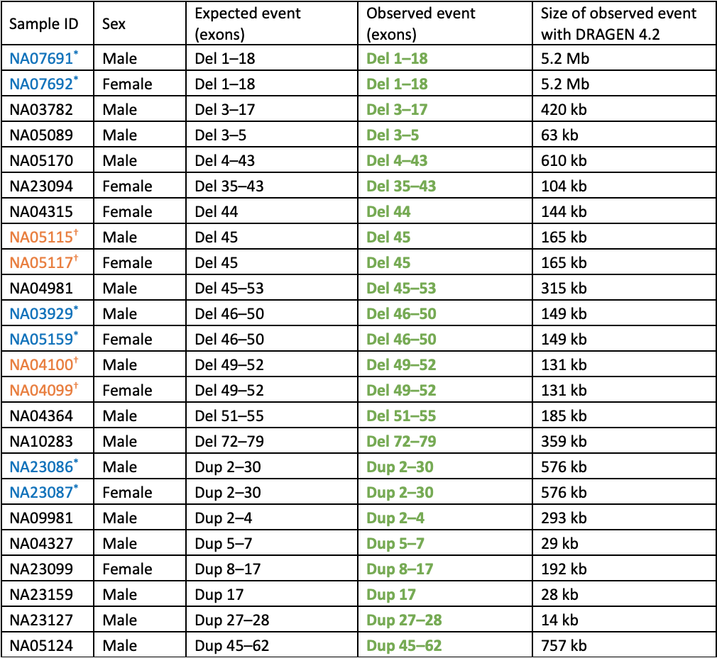 表1:通过WGS和DRAGEN 4.2联合SV检出程序分析具有已知DMD拷贝数变异的细胞系——所有预期事件均已检测到。样本ID以蓝色或橙色显示并带有*或†标志的连续条目为一对样本,其中男性是女性携带者的儿子。与预期外显子、CNV类型(del或dup)和接合性匹配的事件以粗体显示并设置为绿色。女性的所有事件都是杂合子,而男性是半合子。