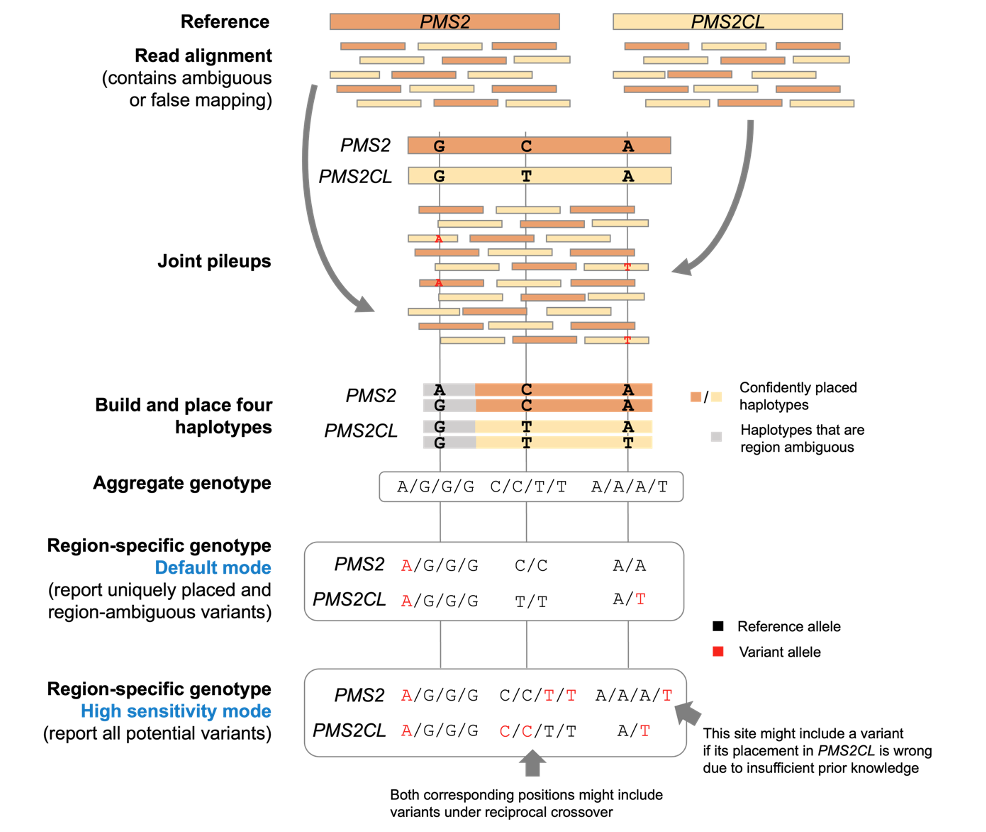 由于假基因PMS2CL的存在,PMS2为Lynch综合征的基因筛查带来了特殊的挑战。这两个区域的高度相似性(图1)给变异检出带来了巨大难度3。源于该区域的read错配和模糊定位会导致假阳性或假阴性结果,从而影响临床决策和患者护理4。目前可用的方法可能需要专门的单基因湿实验室检测,如难以扩大规模的长片段PCR。