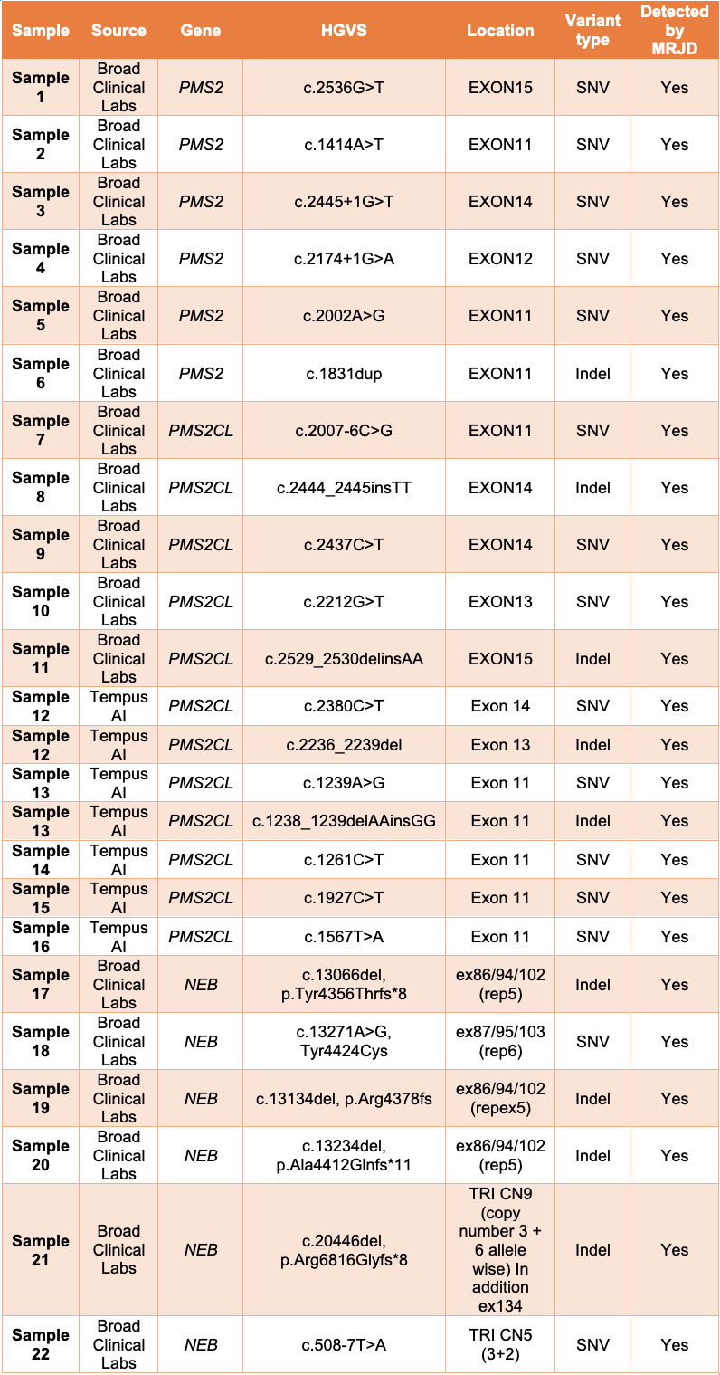 表1:22个非细胞系样本的MRJD高灵敏度模式结果,其中有潜在的临床相关变异——所有列出的变异都经过正交确认,并确定是PMS2、PMS2CL或NEB中的变异。结果由Broad Clinical Labs和Tempus AI提供。