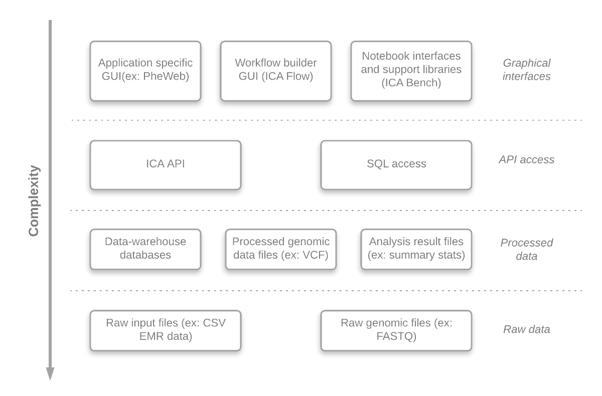 The ICA platform is the foundation on which we built the genomics analysis environment. ICA is an modern cloud-based platform that enables complex use-cases to be addressed, and which we have further enhanced with research-oriented extensions. The platform provides all the necessary infrastructure and features required for building a solution and it is dealing “out of the box” with many of the required non-functional aspects such as encryption, backup, cloud instance provisioning, audit, etc.