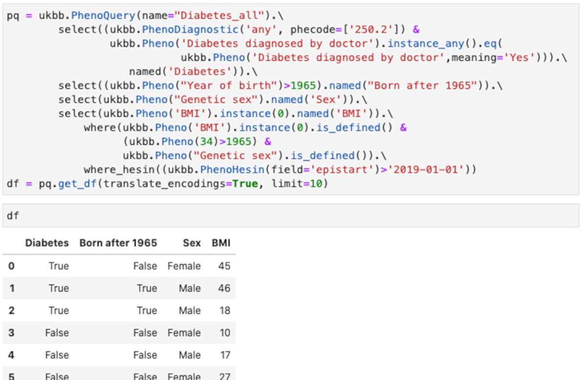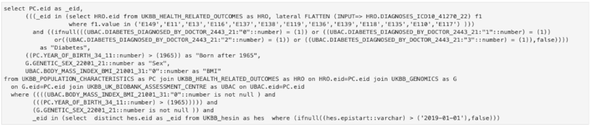 The purpose of the API is to enable the researcher to query the data easier, in a high-level manner. In case the API can’t provide a specific type of query, the user can use it as a starting point and then can adapt the lower-level SQL query to obtain the desired result. For the query in Figure 3, the complete SQL query is shown in Figure 4. It can be seen that while all the information is still there (field codes and titles, values searched, conditions, etc.) it is much harder to read and understand what the original intent was. This is for advanced use cases only and we continually try to improve the high-level API to support a wide range of cases.