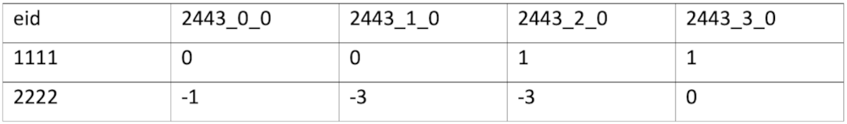 An example of the data stored is (some columns/values were omitted for brevity):