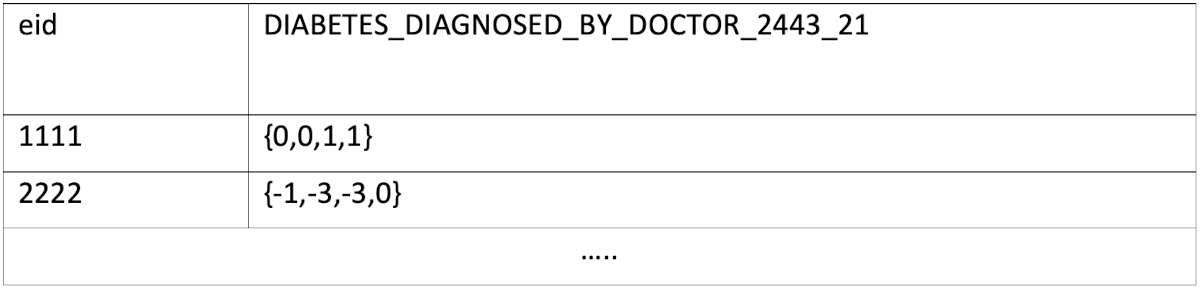It is important to mention that while we have shown here an example of simple categorical data, the UK Bio Bank has multiple types of data (integer, float, date, time, etc.), with various characteristics (ex: instances – which are collections point in time; array values – multiple measurements; etc.)