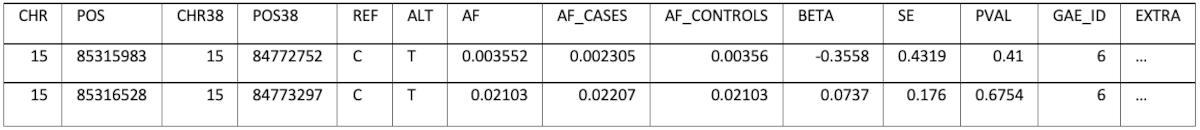 Converting of the position from one of the genome builds to the other and storing only one set of positions would result in information loss, because not all positions can be converted. The decision was to keep each data set’s original coordinates (GRCh38 and GRCh37) and also do the conversion to the missing build (for example: convert FinnGen positions also to GRCh37). This allows full control over the decision that could result in ignoring parts of the information when performing an analysis. The schema has a field (EXTRA) which can store additional, study specific information, as a JSON, which can also be queried if necessary. For example, for Pan UK Biobank the EXTRA field contains: