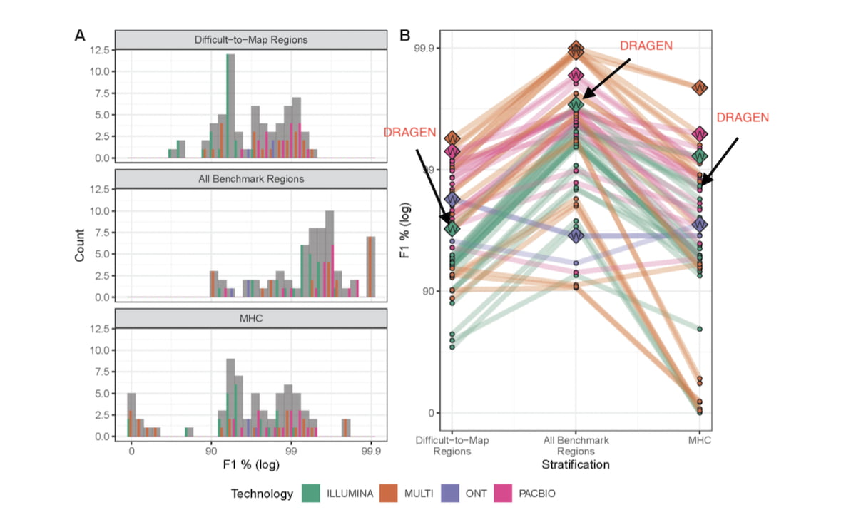 In the summer of 2020, the PrecisionFDA Truth Challenge V2 invited genomics innovators to demonstrate their informatics workflows and show how they can improve DNA coverage and small variant calling accuracy in challenging genome regions. At that time, Illumina DRAGEN’s mapper + variant caller won the accuracy contest for Illumina reads in the Difficult-to-Map Regions and All Benchmark Regions (that’s 92% of the entire genome) categories, with 38% and 28% fewer call errors than the second-best contestants, respectively. Fast forward to today, the DRAGEN team is introducing powerful machine learning (ML) and further improved graph genome mapping (expected to be available in early 2022, as a beta version in the DRAGEN v3.10 release). These new advancements propel DRAGEN to lead accuracy across all read technologies in all benchmark regions and the MHC region. In this blog, we show the results collected in the PrecisionFDA Truth Challenge V2, compare the latest DRAGEN accuracy against the challenge submissions across all read technologies and describe the methods used to reach high accuracy levels.