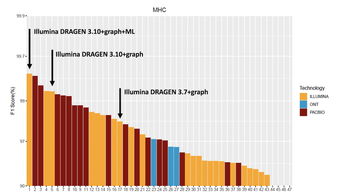 Table 4: Top 6 submissions F1 score across all read technologies for the “MHC regions”. DRAGEN 3.10+graph+ML comes in first place ahead of HiFi PacBio.