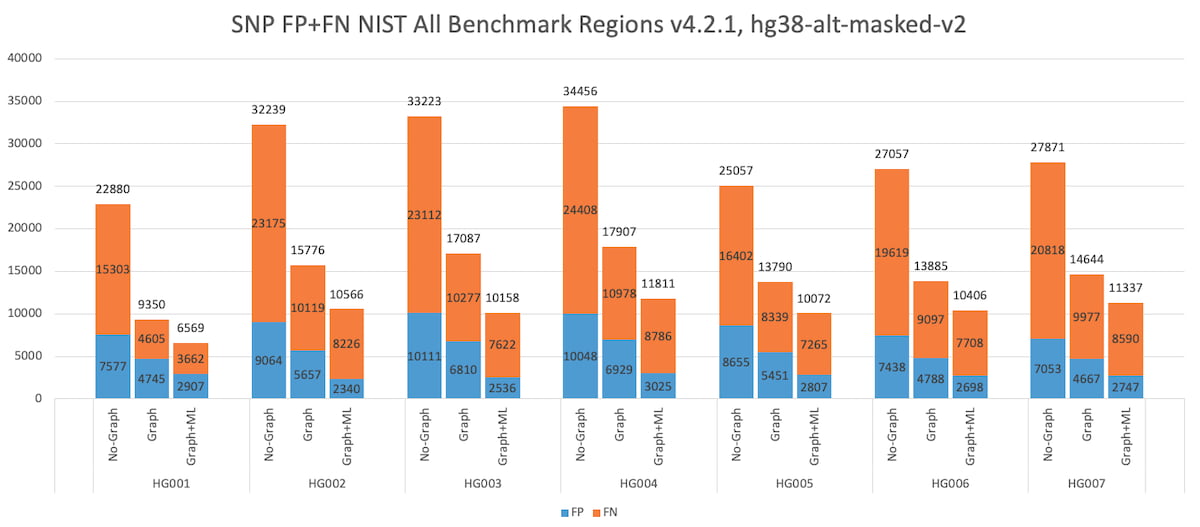 Figure 6 below shows the total number of SNP errors (FP+FN) collected over the v.4.2.1 “All benchmark” regions, for all 7 NIST subjects HG001-7. The results show two key findings: DRAGEN graph reduces the SNP errors by ~50% consistently across all 7 subjects, showing robustness across various ancestries (HG002-4 is a Ashkhenazi trio and HG005-7 is a Chinese trio). Further, DRAGEN ML yields an additional 20-30% SNP errors reduction, also consistently across all 7 subjects.