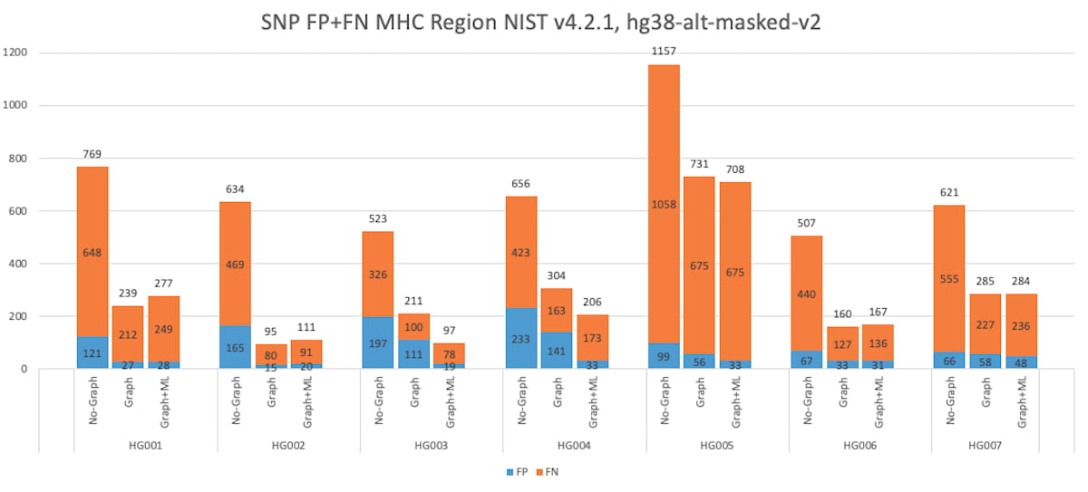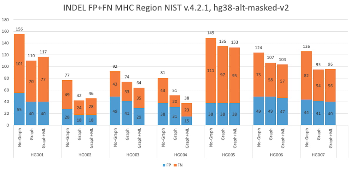 DRAGEN 3.7 version competed in the Illumina reads category and ranked first in two of the three test regions (Difficult-to-Map Regions, and All-Benchmark Regions). DRAGEN 3.7, with graph enabled, significantly reduced false positives and false negatives compared to earlier versions of DRAGEN. Since then, we further innovated on DRAGEN and its methods, resulting in gains in accuracy that puts it ahead in some categories across all read technologies. We show below that the combination of further graph genome improvements and machine learning yields the highest accuracy as measured by the PrecisionFDA Truth challenge V2 in the All-Benchmark Regions and the MHC region.