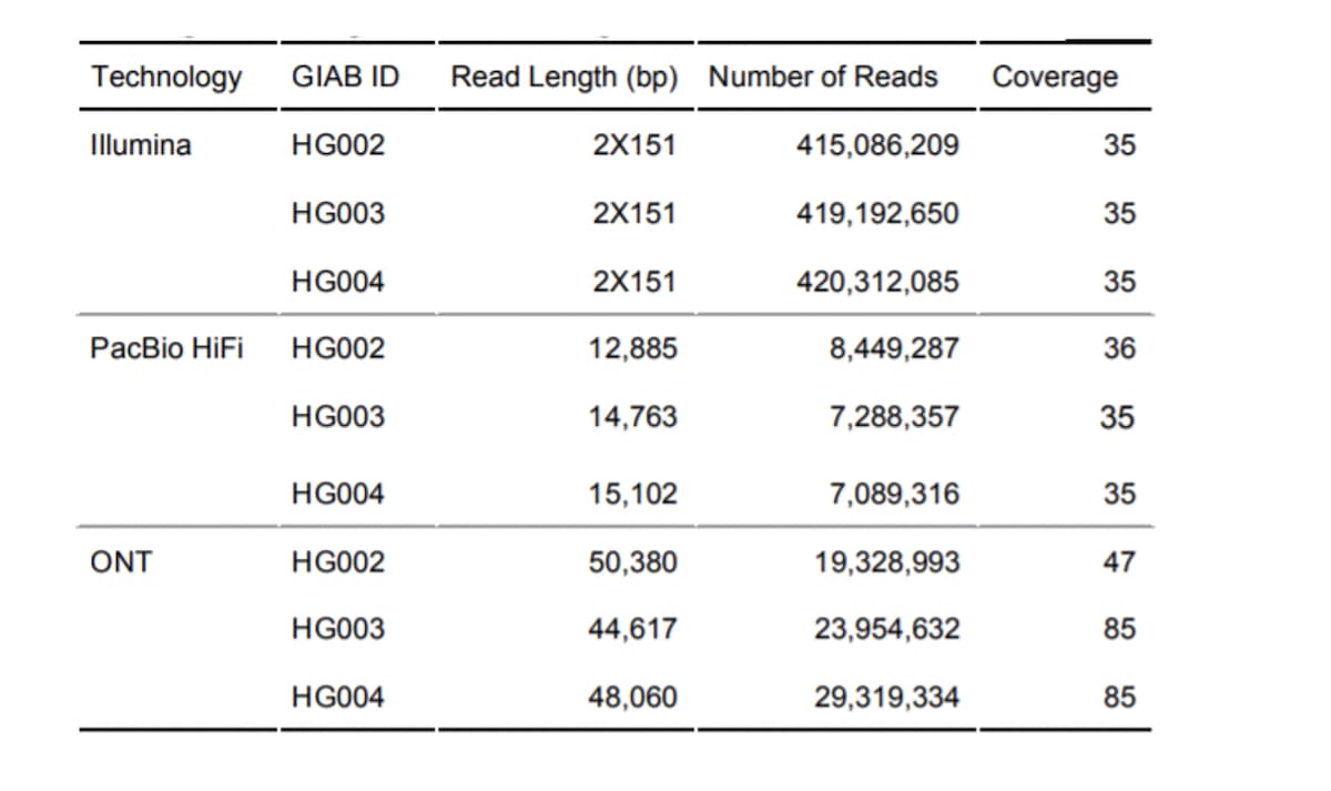 Table 1: Sequencing dataset characteristics, used in PrecisionFDA Truth Challenge V2. Read Length - N50 used to summarize PacBio and ONT read lengths. Coverage - median coverage across autosomal chromosomes.
