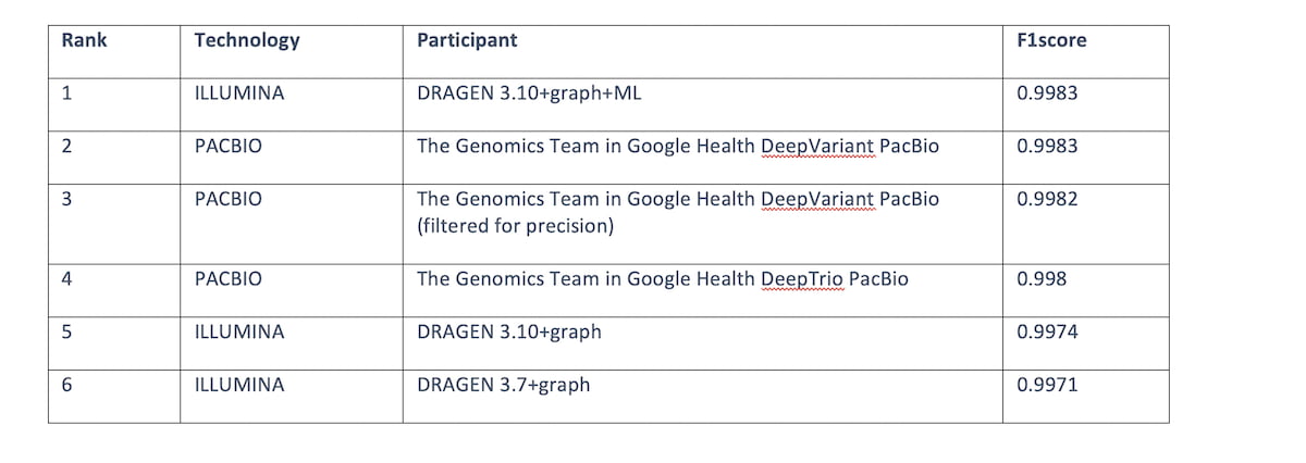 Table 3: Top 6 submissions F1 score across all read technologies for the “All benchmark regions”. DRAGEN 3.10+graph+ML comes in first place tied with HiFi PACBIO.