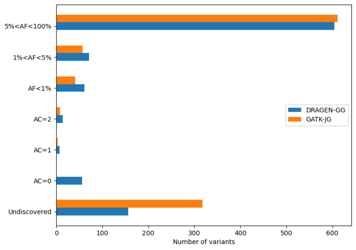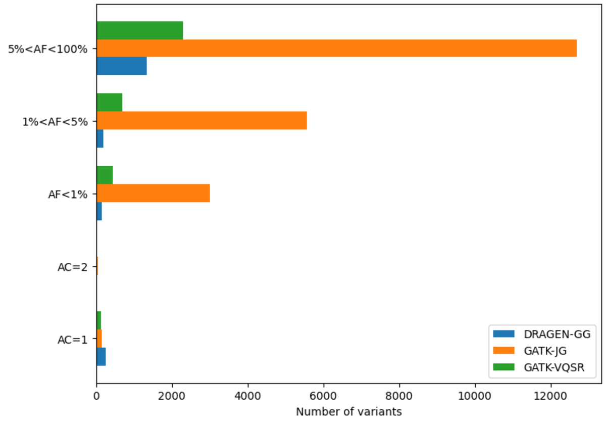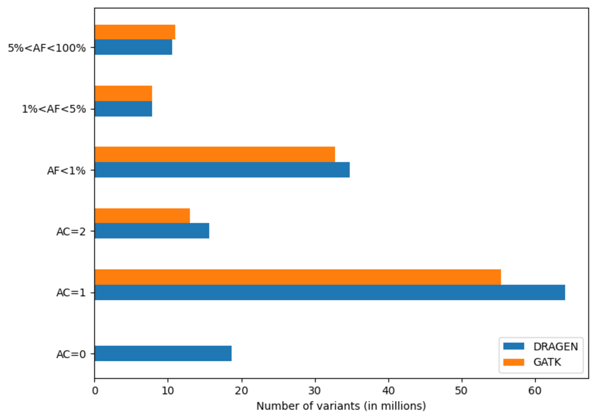 Excluding records with AC=0, there are 127 million sites, with 114 million SNPs,15 million INDELs and 8 million multiallelic variants. By comparison, the analogous GATK call set contains 120 million sites, with 108 million SNPs, 12 million INDELs and 9 million multiallelic variants. Figure 10 shows the distribution of these variants across the allele frequency spectrum, revealing that DRAGEN calls notably more rare variants – there are 13 million more variants with frequency below 5% in the DRAGEN output.