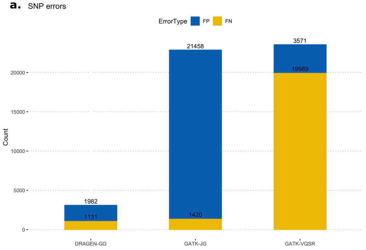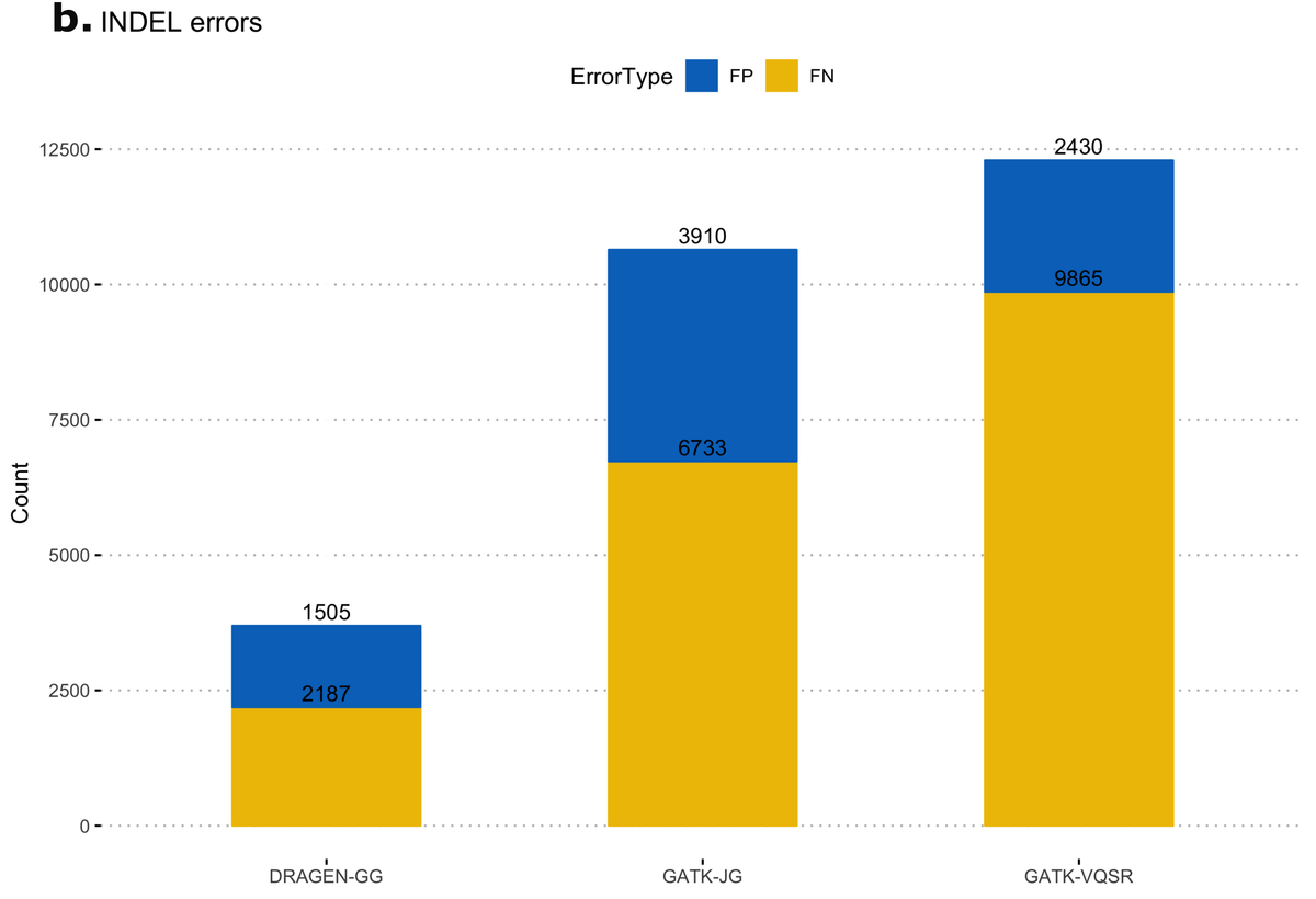 Figure 11 a,b: Error counts for 3 different variant caller pipelines: DRAGEN-GG, GATK-JG, GATK-VQSR for (a) SNP and (b) INDEL.