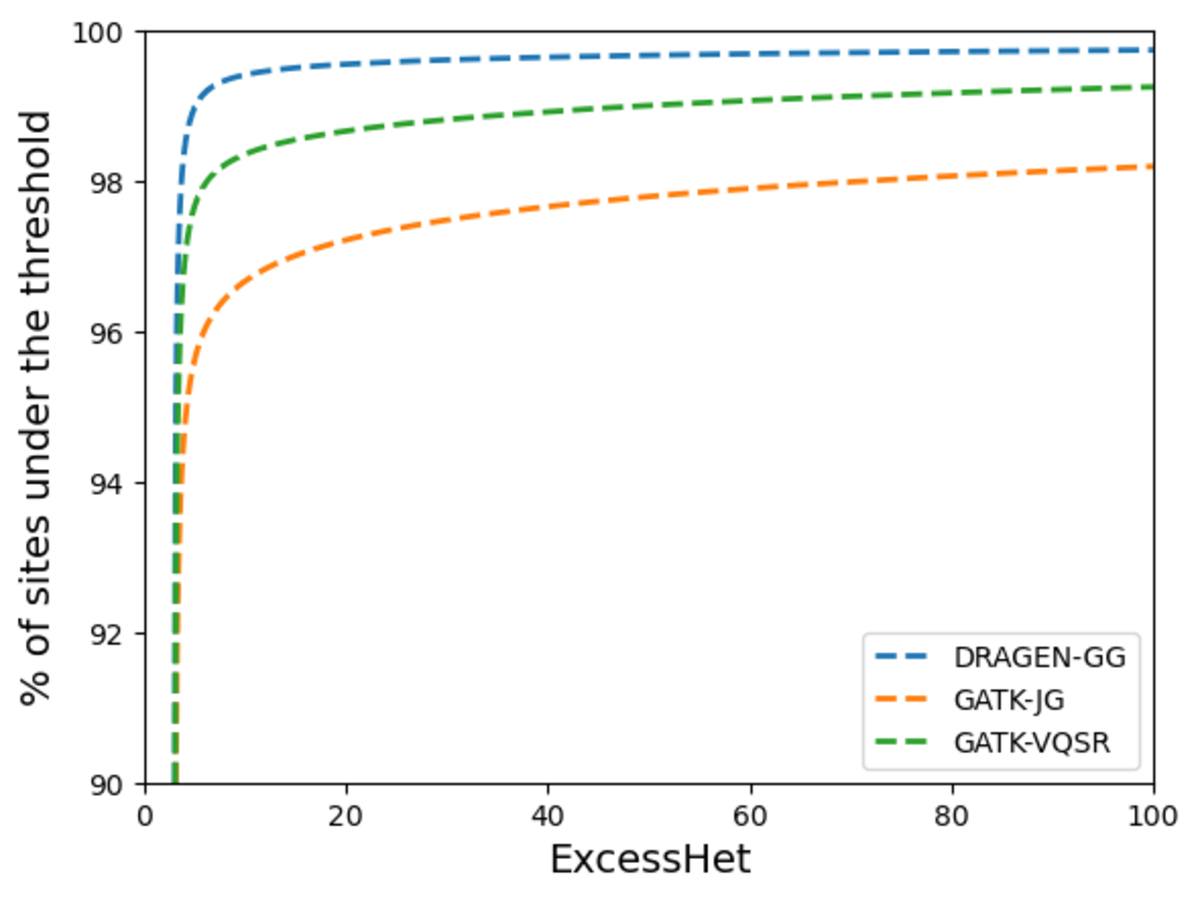 Next, we measured deviations from Hardy-Weinberg equilibrium to compare the proportion of sites showing signs of artifacts in each call set. GATK VariantAnnotator was used to calculate the ExcessHet metric (excess heterozygosity) for each site, representing the Phred-scale p-value for the Hardy-Weinberg equilibrium test. Higher values mean higher chance of technical artifacts. Figure 14 shows the DRAGEN data set has the highest proportion of sites that do not violate the Hardy-Weinberg equilibrium, highlighting the high precision of its calls. We flag for filtering sites with ExcessHet > 28.69, whose p-value corresponds to being more that 3 standard deviations away from the Hardy-Weinberg expectation. This results in just under 0.05% of DRAGEN sites being flagged. We provide this information in a sites-only VCF file accompanying the DRAGEN cohort calls, which includes the ExcessHet metric, together with other commonly calculated site annotations. If users prefer to have all the information in a single file, they can merge the DRAGEN output and the sites-only VCF with the following command: