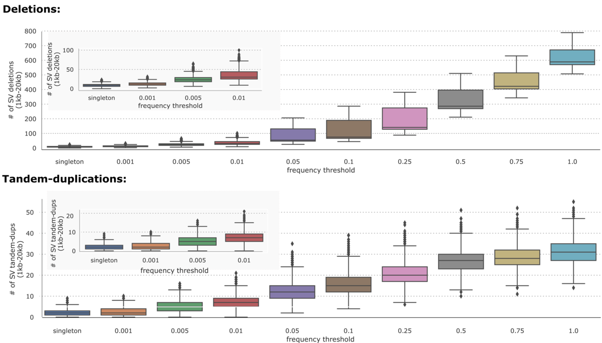 Figure 2: Distribution of deletions and tandem-duplications called by DRAGEN-SV pipeline across different frequency thresholds.