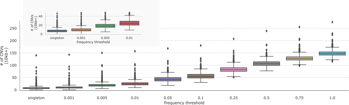 Aggregating CNVs across samples, we see about 150 calls per sample greater than 10kb in size. As with small variants, we note that many CNVs are very common with about 25 variants remaining at a 1% frequency threshold and 6 singleton variants per sample.