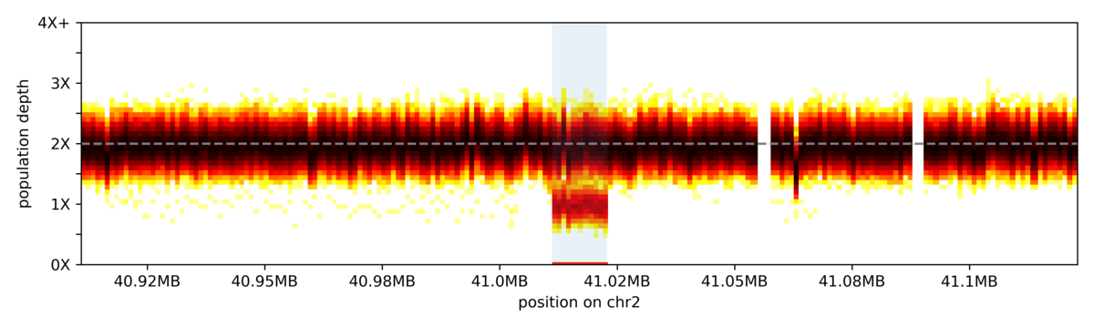 The vertical slices in the heatmap represent coverage bins, and intensity of colour for each slice represents the distribution of sample depth of coverage across the 1000 genomes cohort for that given bin. The highlighted region indicates the coordinates for a common deletion.