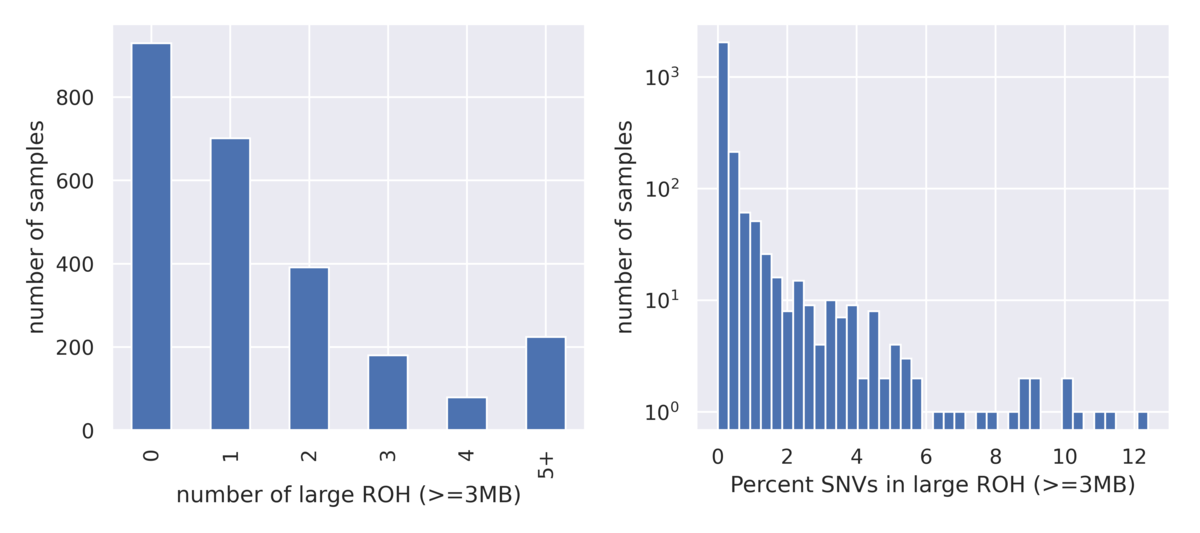Figure 7: Distribution of the number of large ROH blocks as well as the fraction of SNVs in a large ROH block calls across the 1000 Genomes Project dataset.