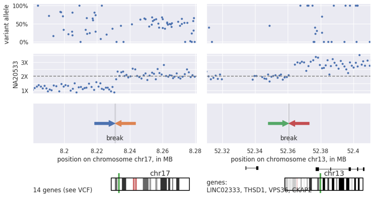 This example shows how the DRAGEN pipeline facilitates viewing of a rare large variant across many scales and allows us to observe the genome from the perspective of both read depth and split reads. With the CNV caller and associated coverage data, we get very reliable calling and clear interpretation of variants, while with the structural variant caller we get breakpoint resolution and an understanding of the mechanistic formation of this particular genomic rearrangement.
