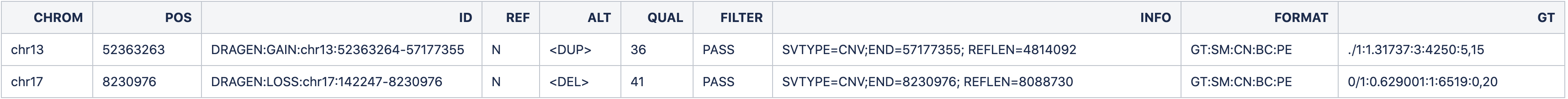 In the Figure 8 above, we can see a very large duplication on chromosome 13 as well as a large terminal deletion on chromosome 17, suggestive of an unbalanced translocation. Moving on to the CNV calls (Table 3), we can see the deletion represented in a single LOSS call, while the duplication is split across 5 separate calls. This splitting is due to the presence of common copy number variation or noise splitting the variant call into pieces as is common for such large CNVs.