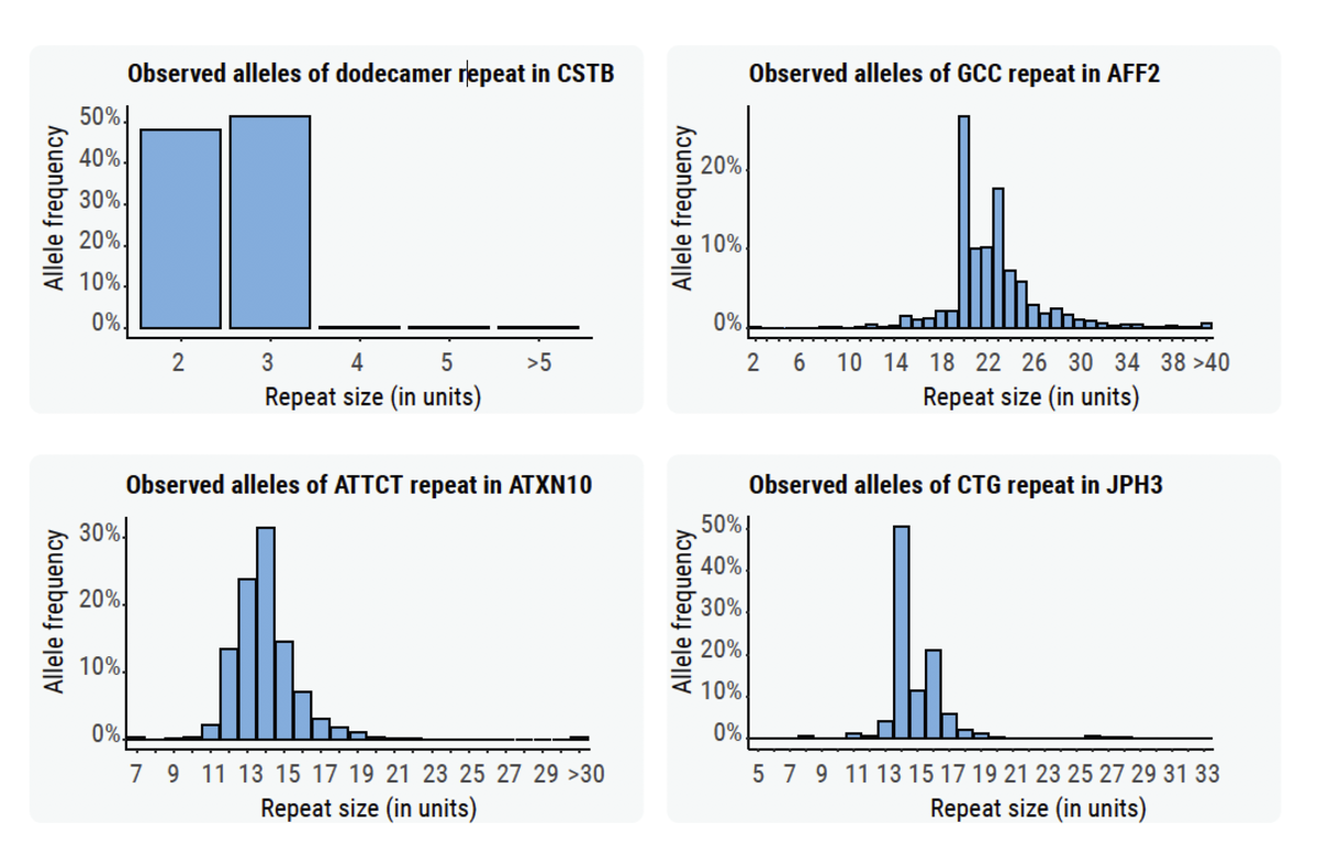 Figure 5: Allele frequencies for STRs in CSTB, AFF2, ATXN10, and JPH3 genes across samples from the 1000 Genome Project.