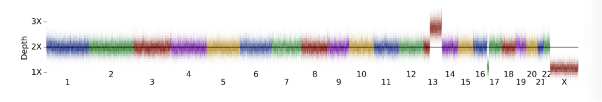 We can use the 1000 Genomes data to examine the distribution of ploidy calls across a diverse array of samples (Figure 6), allowing us to better understand the detection limit of whole chromosome ploidy changes in a way that is not feasible in traditional benchmarking datasets often consisting of less than a handful of samples. Evaluation of the chromosome coverage across this pool of samples allows us to see that the vast majority of chromosomes lie between 90% and 110% of the expected coverage, while a small number of outliers have gains in coverage.