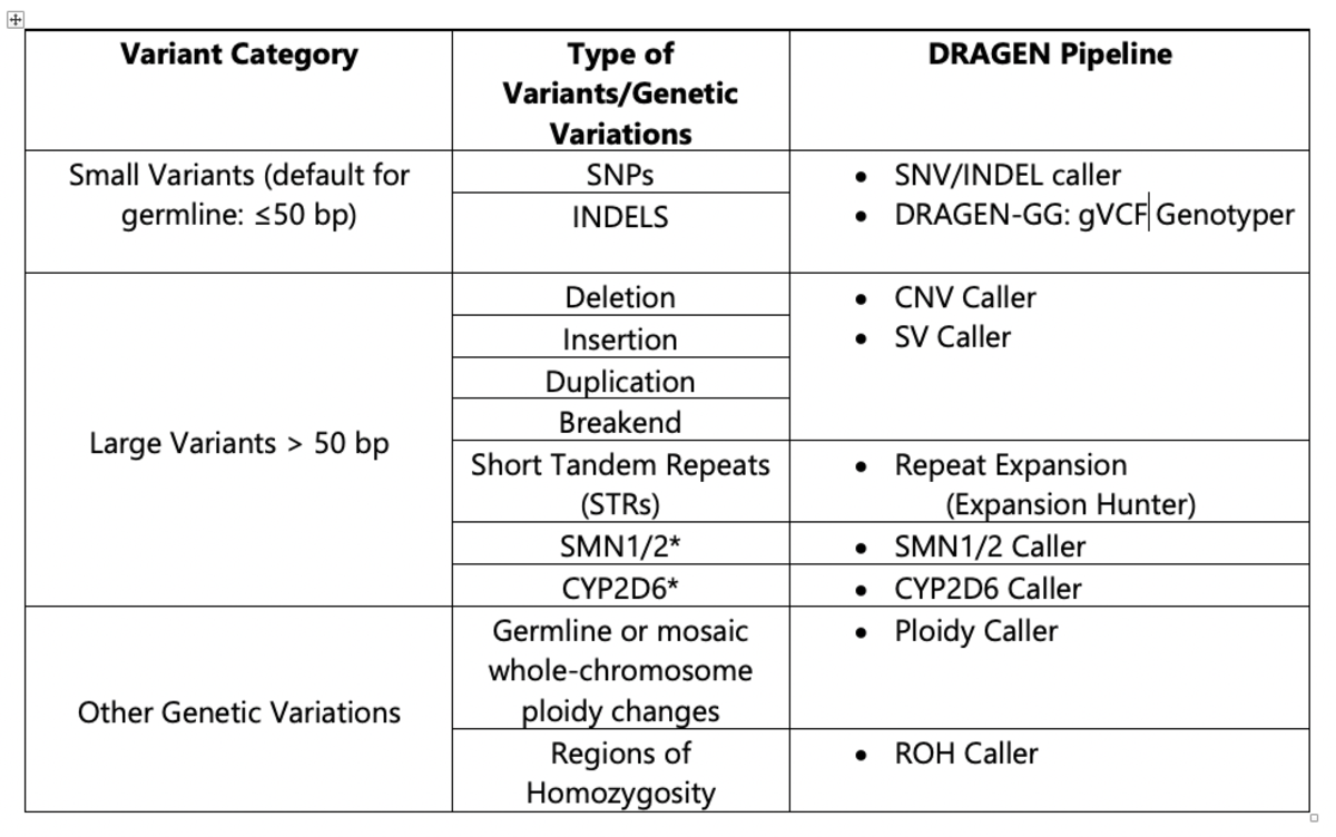 The DRAGEN platform features multiple pipelines that are used in conjunction in order to call small and large variants with high accuracy from a cohort sampling. Table 1 describes the DRAGEN pipelines available for variant calling.