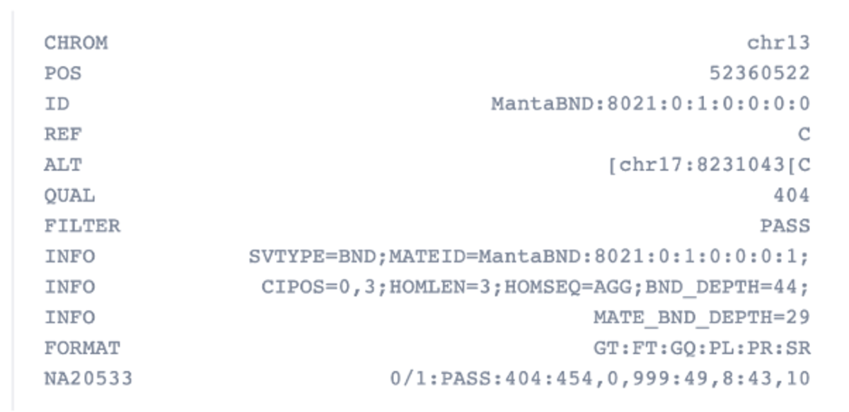 Table 4: VCF record for translocation breakpoint in NA20533.