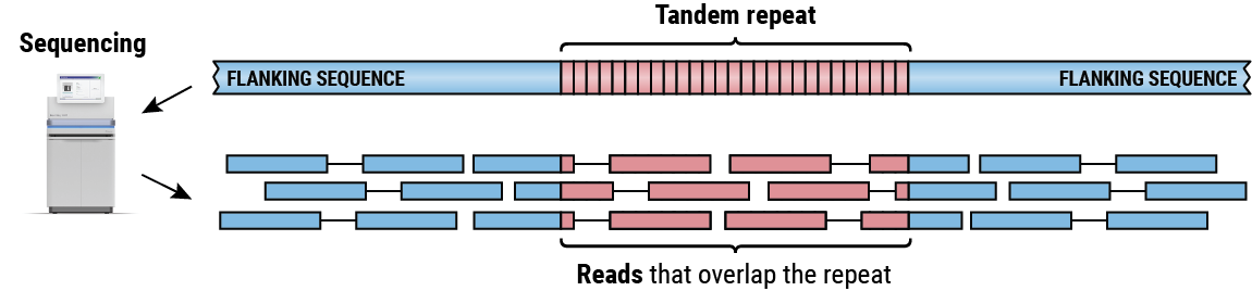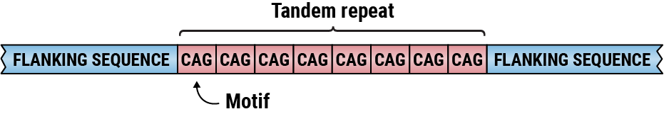 Sequences consisting of repetitions of relatively short pieces of DNA, known as tandem repeats (TRs), occur throughout the genome (eg, Figure 1). TR mutation rates can be 10’s to 1000’s times higher than other genomic regions making TRs large contributors1 to the human genetic variation. TRs largely mutate through “slippage” where the number of repeats increases or decreases between generations. Accumulating evidence shows that TRs play a role in basic cellular processes2,3 and large expansions of tandem repeats are linked to a variety of neurological disorders including amyotrophic lateral sclerosis (ALS), fragile X syndrome, and various forms of ataxia.