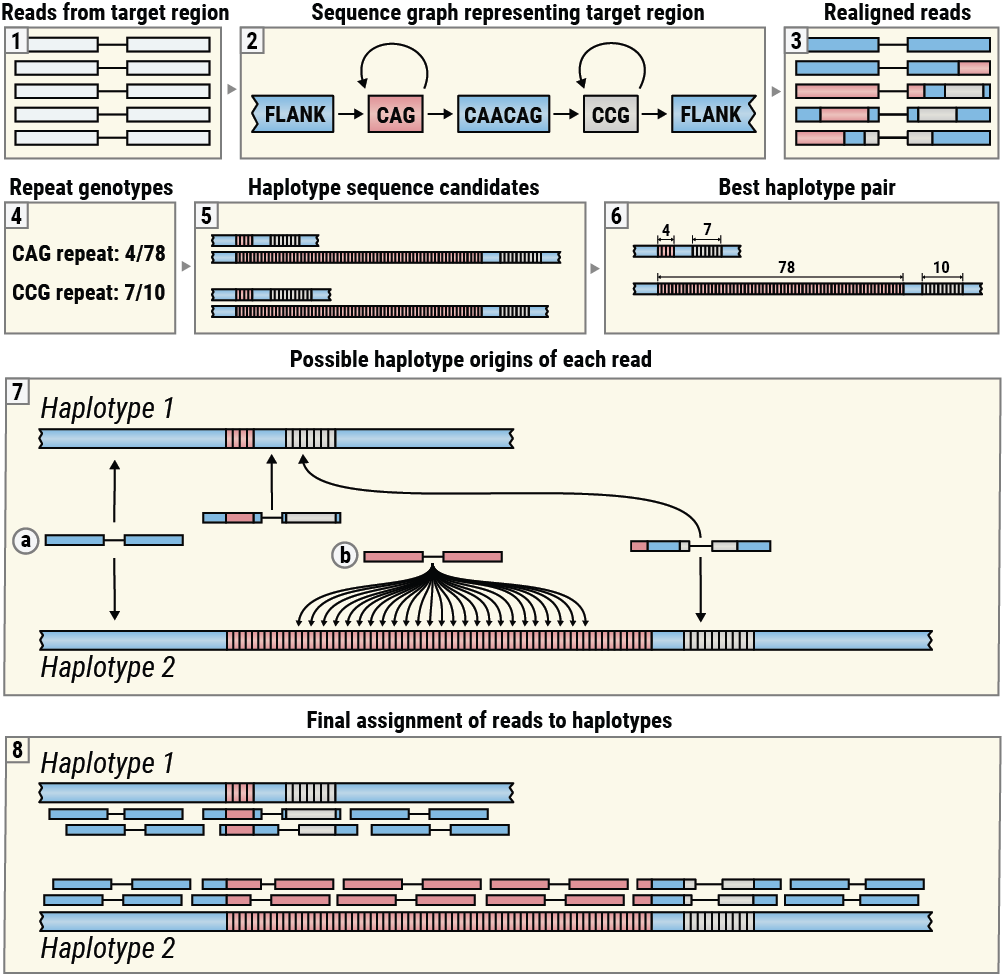 This algorithm is based on the idea that if a given locus is sequenced well and each constituent repeat is genotyped correctly, then it is possible to distribute the reads to achieve an even coverage of each haplotype. (Although many reads may not be assigned to the correct haplotype of origin, especially in cases when the repeats are homozygous, and the resulting haplotypes are identical.) Conversely, if the size of a repeat is significantly overestimated or underestimated, no assignment of reads will result in an even pileup making the genotyping error easy to notice.