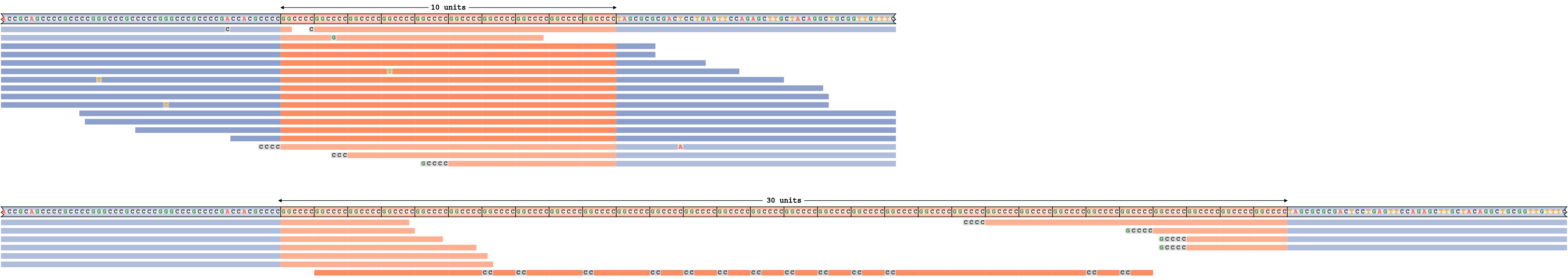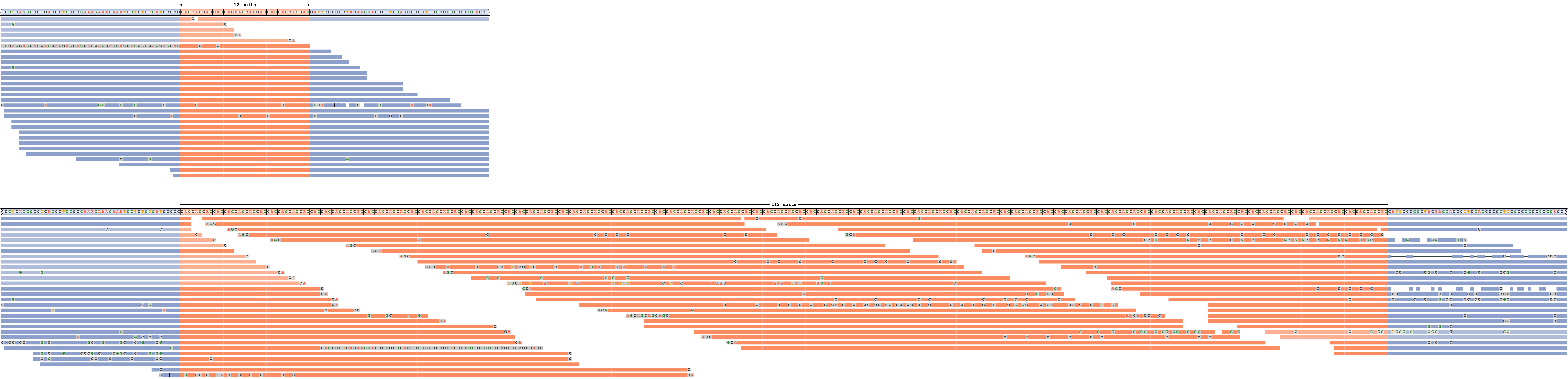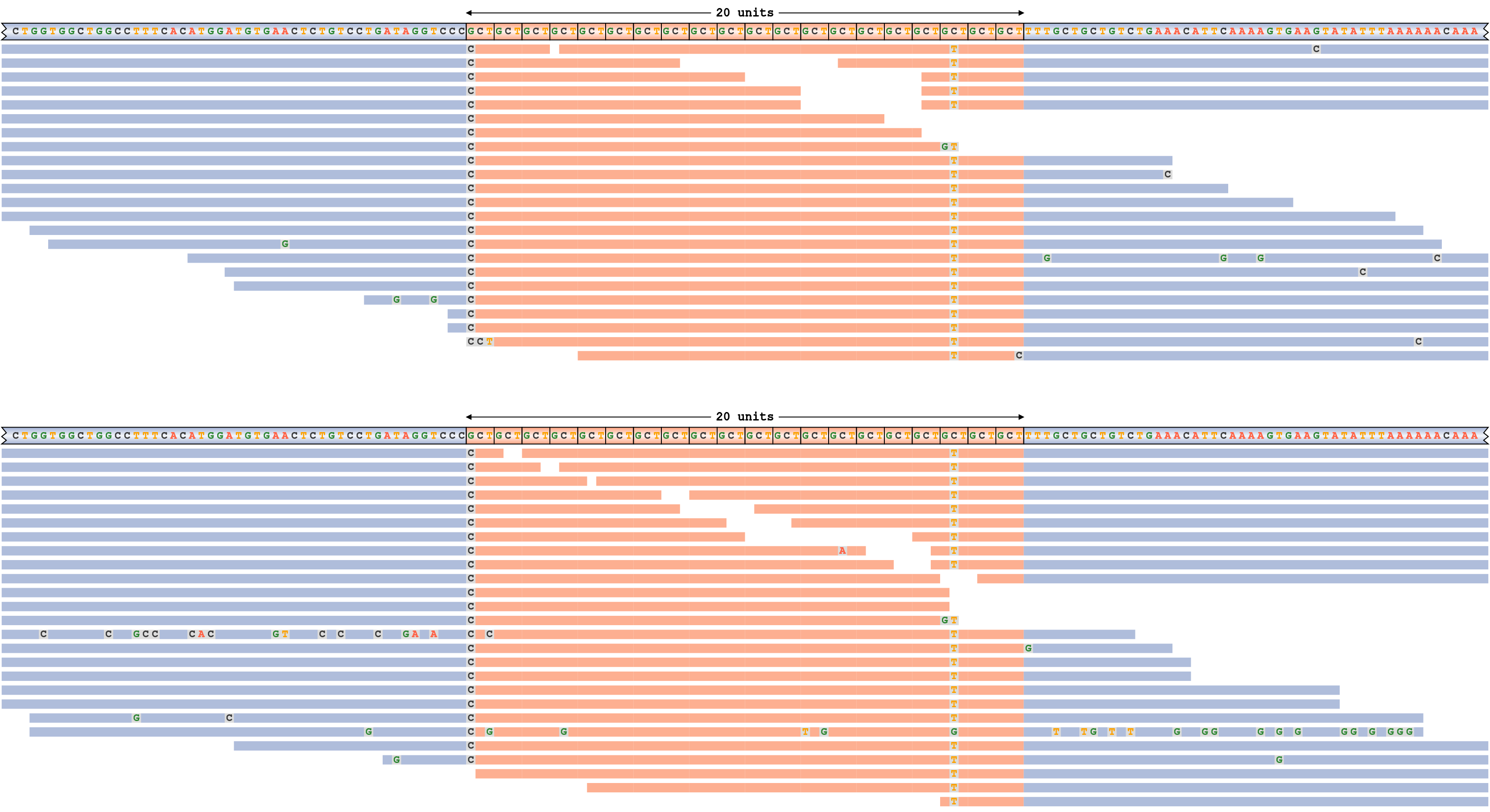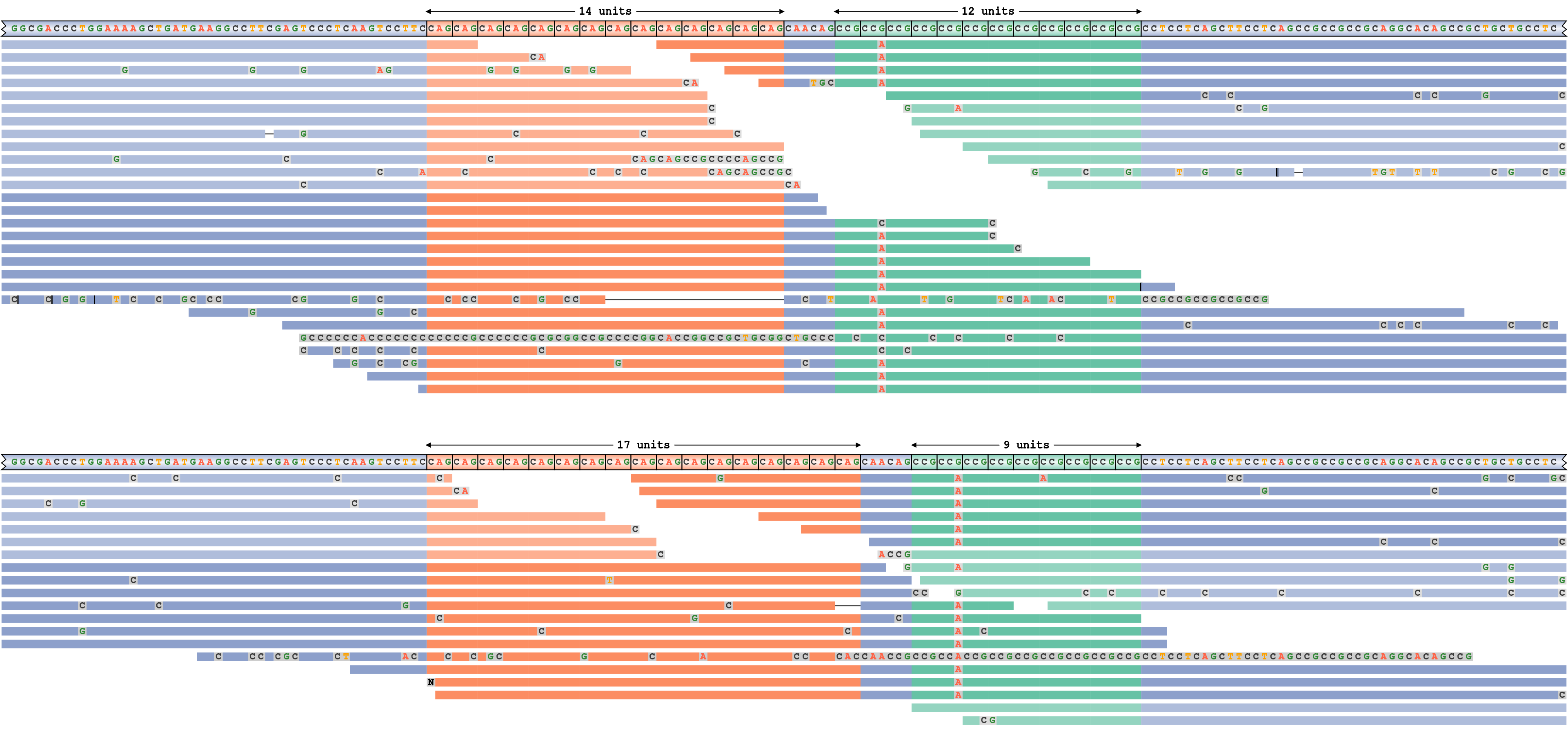 Consider a read pileup for ATXN3 repeat whose alleles are shorter than the read length depicted on Figure 4.  This repeat is genotyped 20/20 (20 motif copies on each allele). Each panel of this plot corresponds to a haplotype (the haplotype sequence shown in the top row). The haplotype sequences and the reads are colored according to their overlap with the repeat (orange) or the surrounding flanking sequence (blue). All mismatching bases in reads are shown.