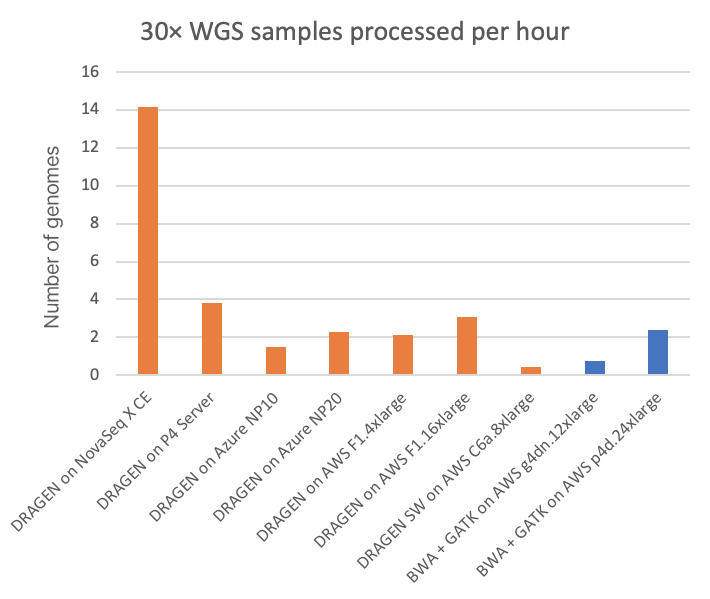 为了处理典型的30×覆盖度的人类全基因组,可以使用各种计算平台。某些应用需要快速的二级分析来更快地获得答案。其他应用可能会因为产生的数据量而受益于快速二级分析,而NovaSeq X嵌入式二级分析完全能够满足此类需求。