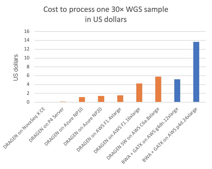 当处理大量数据时,还必须考虑计算成本。在NovaSeq X仪器中,DRAGEN计算功能包含在仪器成本中,因此对NovaSeq X用户来说实际上是免费的。然而,如果我们将计算组件成本分摊到测序通量和仪器的预期五年寿命上,我们将得出每个30×WGS样本的成本。