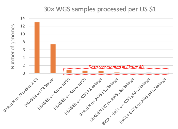 图3以单个30×WGS样本的成本为对象,将其与不同云端计算实例上的其他几种DRAGEN和第三方流程(所有列出的云端均显示“按需”定价)进行了比较。图4A显示了每美元可以处理的30×WGS样本的数量,放大图4B为图4A的详细视图,去除了专用DRAGEN硬件数据点(NovaSeq X CE和DRAGEN P4 Server的每美元样本数非常高,因此需要扩大y轴刻度以便更好地查看其他云端选项定价的细微差别)。