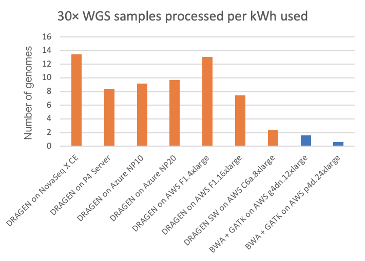 关于基因组学即将面临的计算瓶颈,业内有很多说法,似乎计算成本、功耗和/或周转时间会以某种方式导致基因组学目前的进展突然放缓或停止。有了FPGA加速,这样的瓶颈似乎不存在了。 机载FPGA加速DRAGEN可以在不到5分钟的时间内全面分析30×人类基因组,计算成本不到10美分,所需的能量与推动最高效的特斯拉Model 3行驶半公里所需的能量差不多。