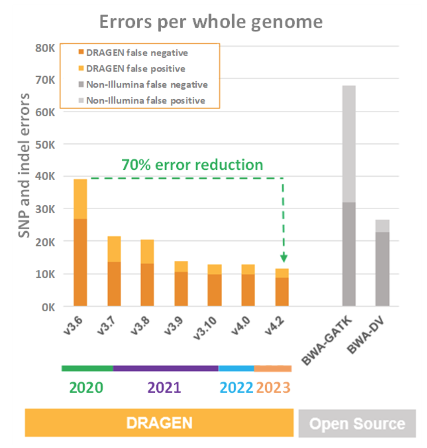 在上文关于通量、成本、功耗和占地面积的比较中,NovaSeq X机载DRAGEN计算平台都名列前茅,令人印象深刻。但这些图表并不能完全说明为什么选择FPGA来加速DRAGEN。之所以选择FPGA来加速DRAGEN,是因为FPGA在通量、成本、功耗和占地面积方面都具有优势,可以应用更多计算密集型算法,从测序仪读取的数据中获取尽可能多的有用信息。DRAGEN在这方面已经非常出色,现在正在不断超越自己,每一次DRAGEN流程的发布都在不断地提高精度、灵敏度和特异性。下图7对此进行了总结,图中显示了第三方二级分析流程(BWA+GATK和Google Deep Variant)和几代DRAGEN的假阳性和假阴性指标。
