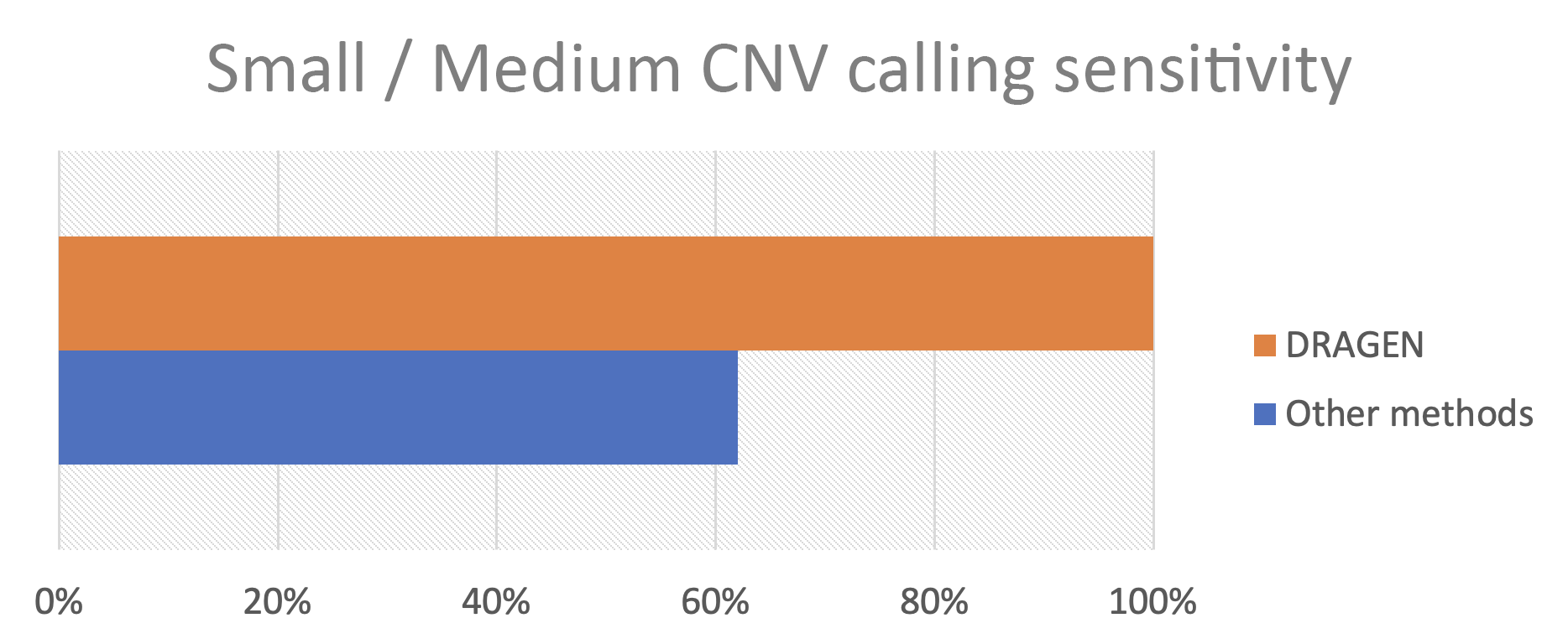 过去,检测这些大小各异的变异需要使用多种不同的检测方法。通过结合因美纳全基因组测序(WGS)与DRAGEN Bio-IT平台内置的二级分析算法,研究人员可以借助混合方法对这些不同类型的所有变异进行高灵敏度检测。DRAGEN v4.2首次引入了一个新选项,支持将基于覆盖度的拷贝数变异(CNV)检出和断裂端结构变异(SV)结果相结合,可更好地解析中小型基因组的增加和丢失事件。这类变异带来了巨大的技术挑战,因为它介于传统测序方法和芯片方法(分别用于较小和较大片段变异)之间。